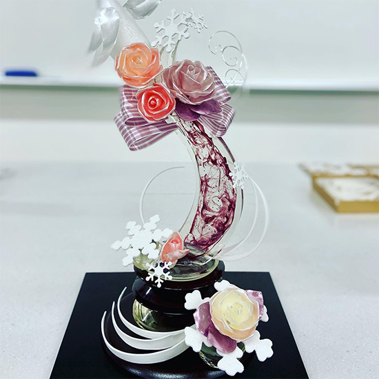 午前の部 2年生の授業では、2015年ミラノ万博世界大会で優勝した際の、大会のテーマである「テクノロジーの進化」を表現した作品を学生たちの目の前で制作してくださいました。
