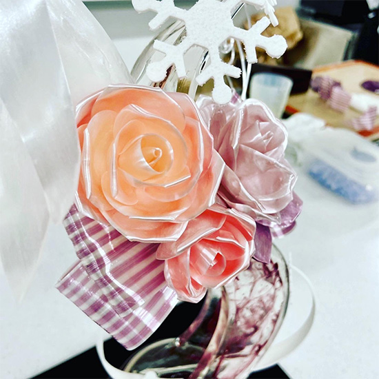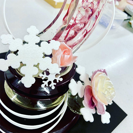 午後の部 1年生の授業では、飴ポンプで作った鳥と雪の結晶を使った作品を制作してくださいました。