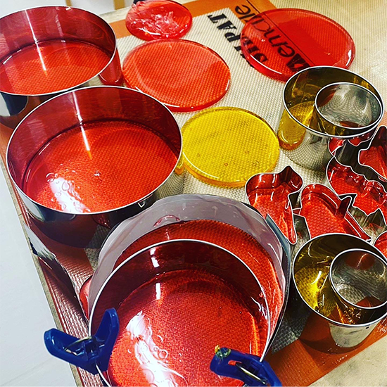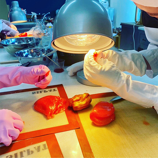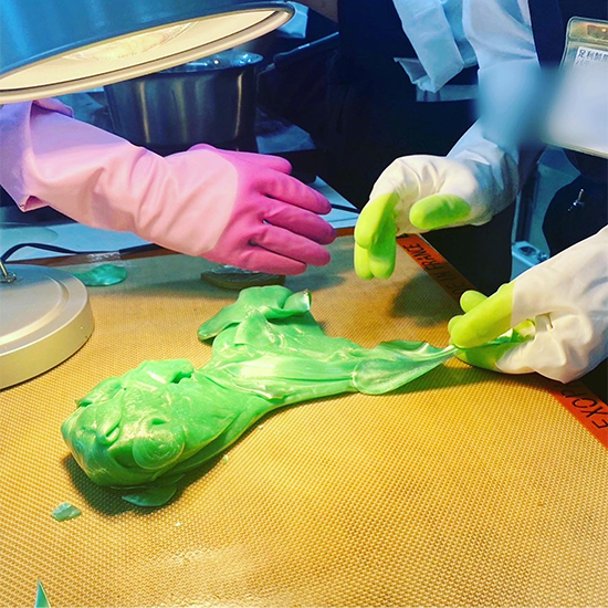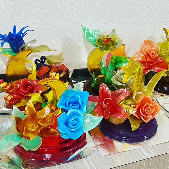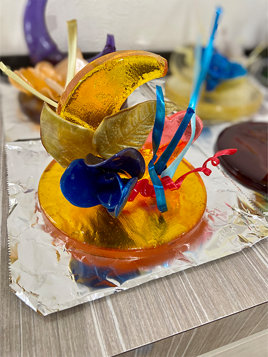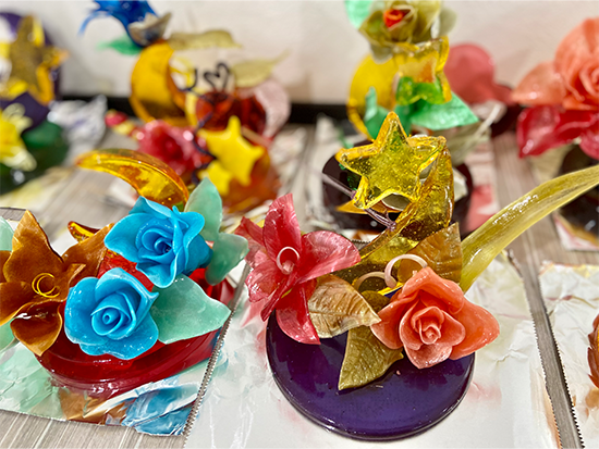 それぞれ好きな色を加えて型に流し、作品の土台を作ります。引き飴はシリコンマットの上に流し、冷めたら飴の端を持って艶が出るまで引いていきます。飴は冷めると固まり割れてしまうので、飴ランプで温めながら作業をしていきます。