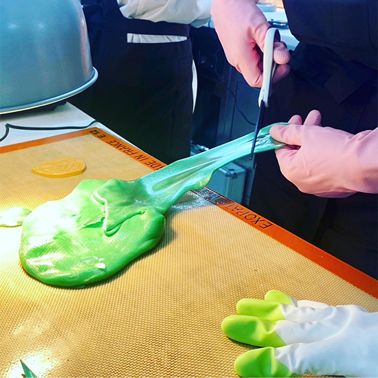 この時の飴は60C近くあり、布の手袋の上からゴム手袋をして作業をします。昔はこの作業を素手で行っていたそうです。パティスリーコースの学生は授業で飴細工を行っていた為、慣れた手付きで葉っぱやバラの花など作っていきます。この日飴細工に初挑戦だったカフェベーカリーコースの学生達も、山嵜シェフに飴の引き方をしっかりと教わり、終始楽しそうに作品を作っていました。