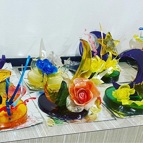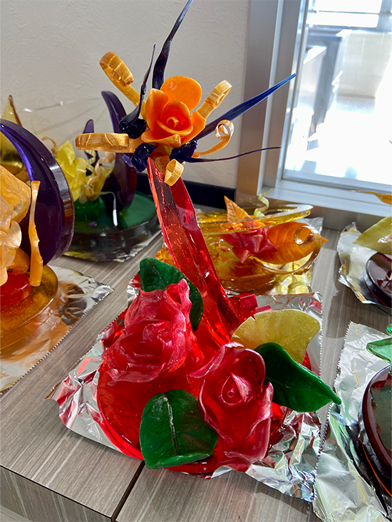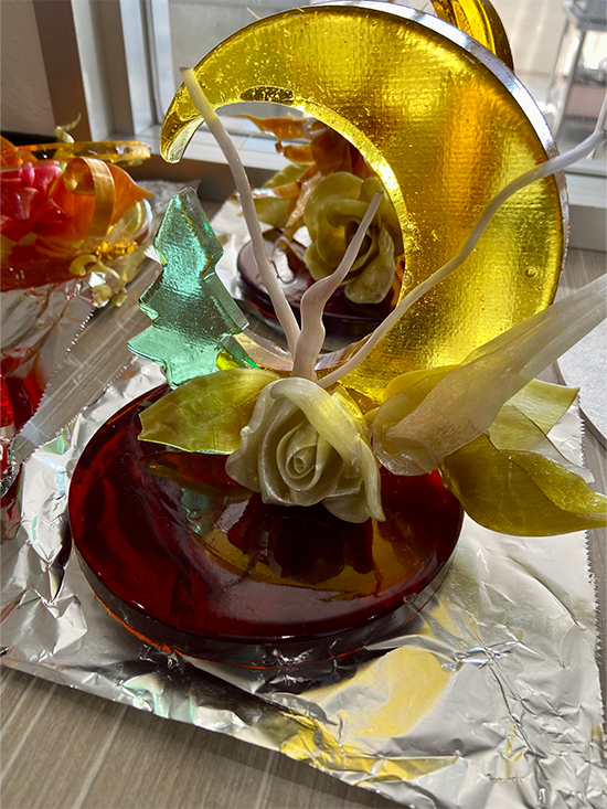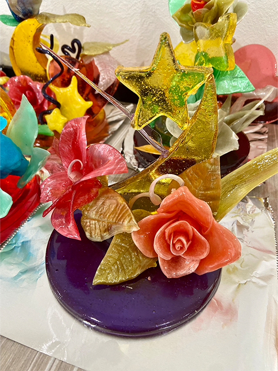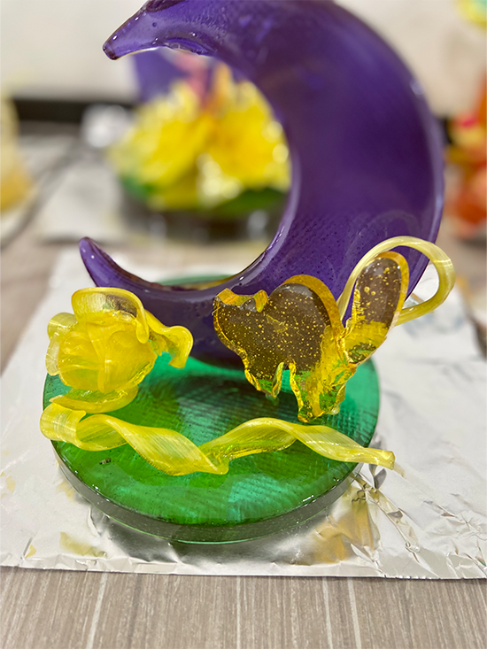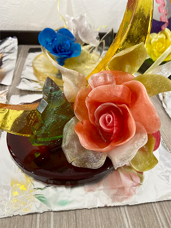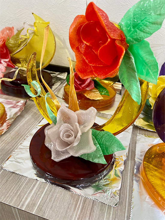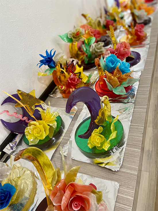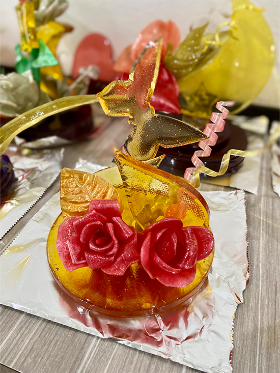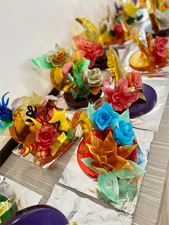 1日4コマをかけて、1人が1台の作品を仕上げました。飴細工の主な技法として引き飴・流し飴・吹き飴とありますが、この日は引き飴・流し飴に挑戦しました。
