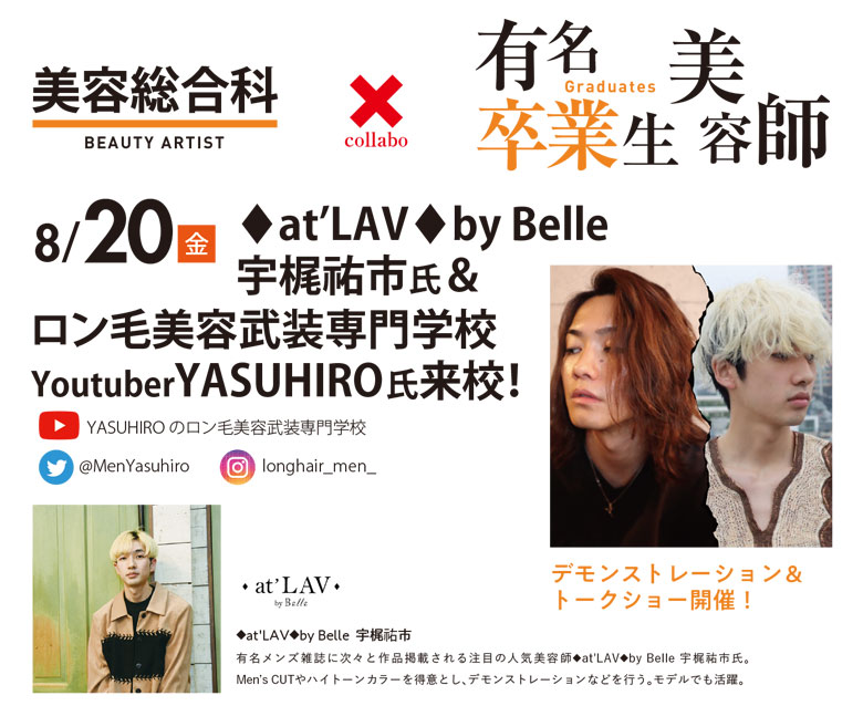 8月20日(金)のオープンキャンパスは人気美容師♦︎at’LAV♦︎by Belle(アットラブ バイ ベル)の宇梶 祐市氏と、【清潔感のあるロン毛】を目指して日々研究中のロン毛美容武装専門学校YASUHIRO氏の2名を招き、メンズカットデモンストレーション&トークショーを行います。