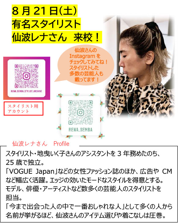 8月21日(土)ファッションデザイン科オープンキャンパスに有名スタイリスト仙波レナさんが来校します。