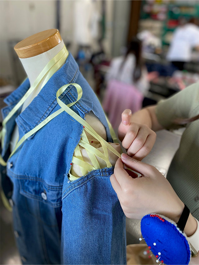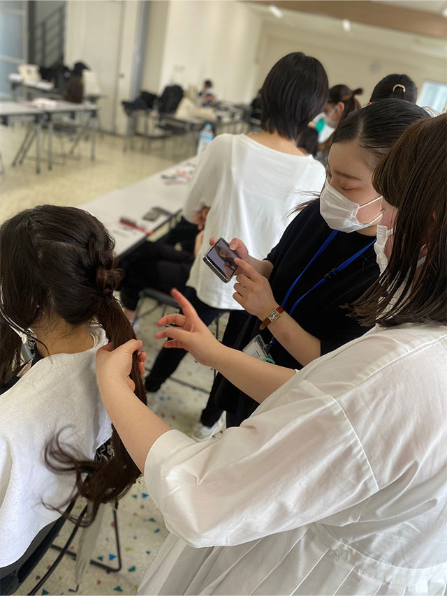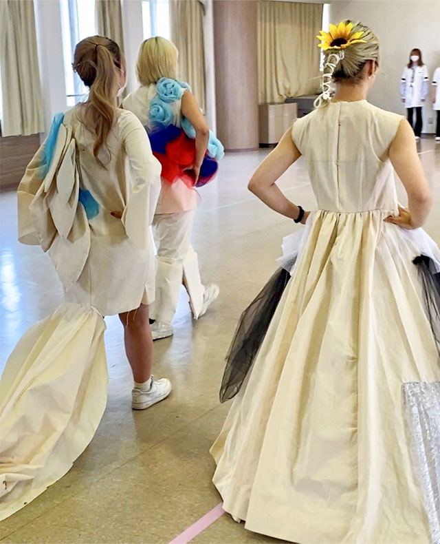 代表学生たちの打ち合わせ、ウォーキング、衣装・舞台製作、ヘアメイクの練習など、みんなが意見を出し合い、力を合わせながら、日々の授業と並行して制作しています。
