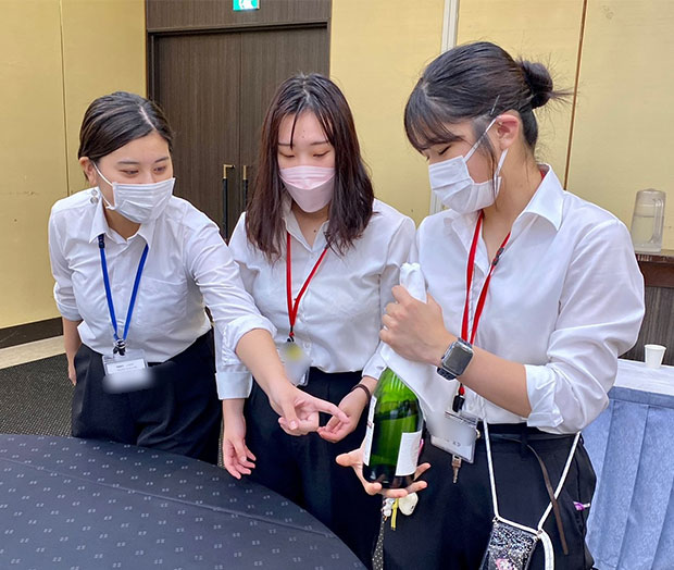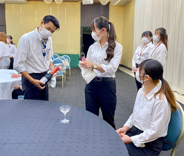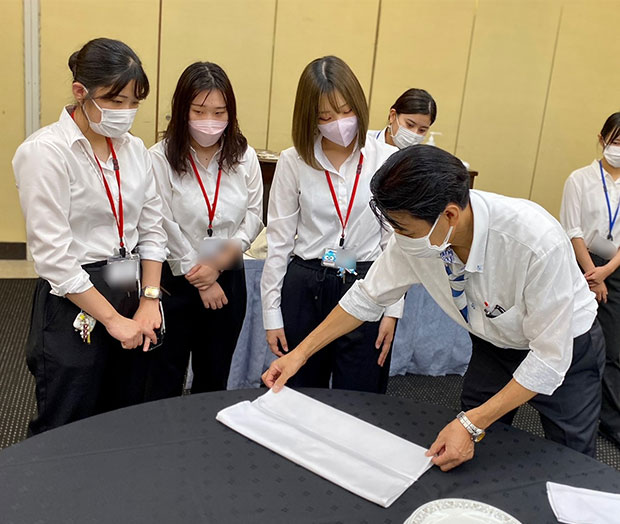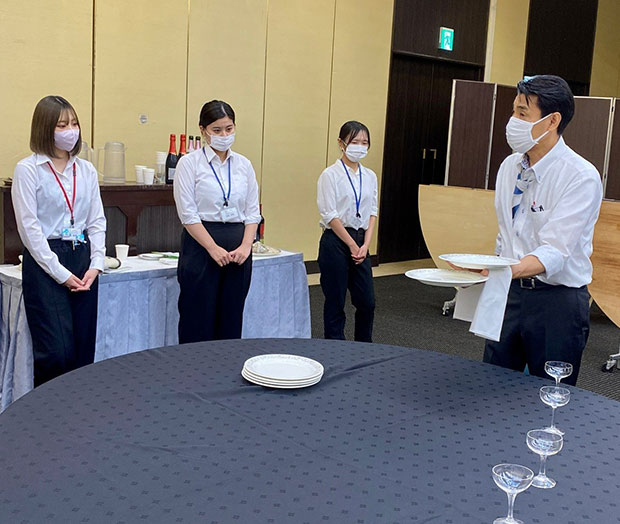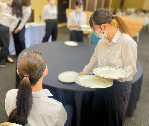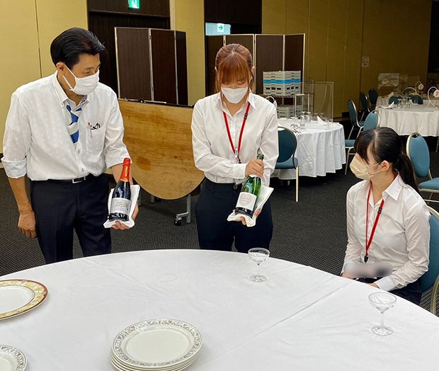 プレートの置き方、ドリンクの注ぎ方、ナプキンのたたみかた、立ち位置など、実践しながら学びます。