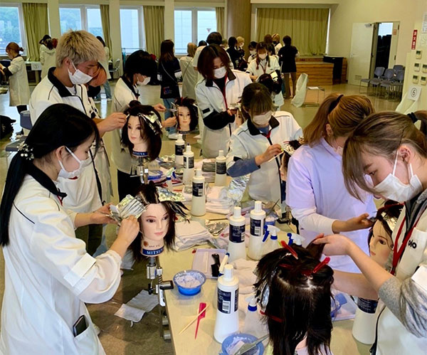 そして午後は、カラーリング実習。ヘアブリーチ剤を使用し、ウイービング技術を学びます。ウイービングとは、毛髪すべて染めるのではなく、間引きして毛髪の一部分を染める技術です。近年では、ハイライトやインナーカラーなどがあります。