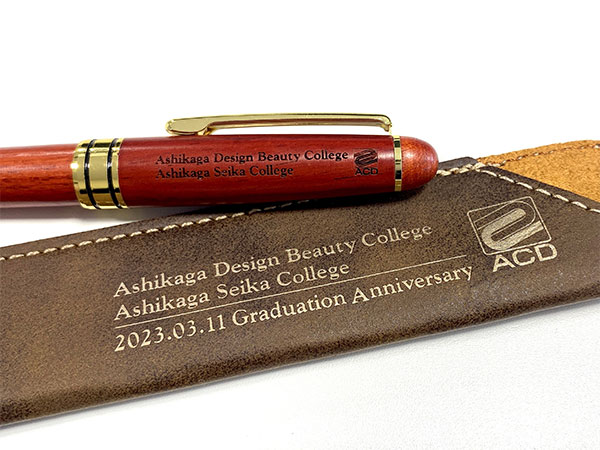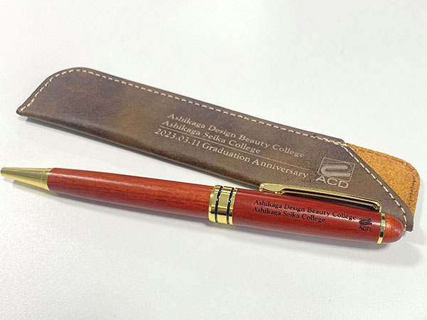 2年間の学校生活を皆勤で過ごした学生には、皆勤賞として、本校卒業生が勤務している島田産業有限会社様制作のウッドボールペンとレザーペンスリーブが贈られました。
