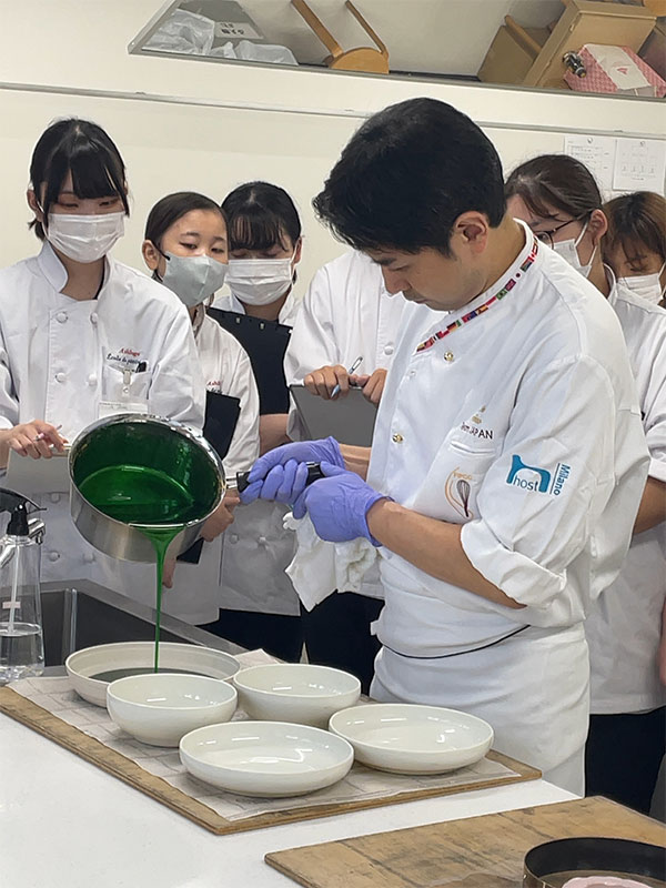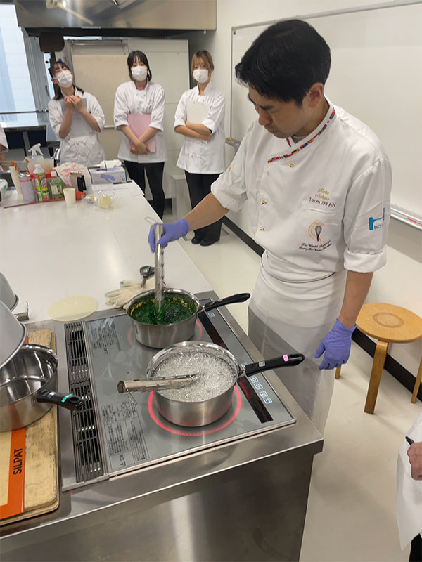 世界大会で優勝された経験を持つ中野シェフの技術を至近距離で見ることのできる経験は、今後の学生達の技術向上へと繋がります。