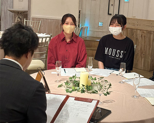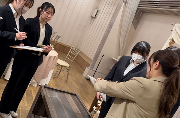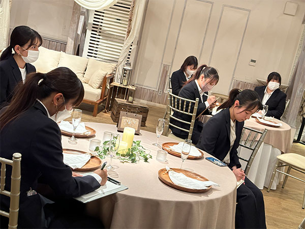 お客様の要望を伺いながら、結婚式を提案するプロのヒアリング力と提案力に驚き、また、お客様への気遣いやスタッフの方の表情・仕草など学ぶことの多い貴重な授業となりました。