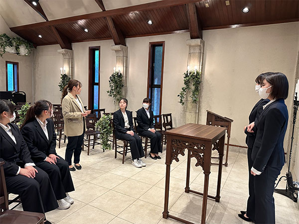 学生が新郎新婦役となり、ザ サリィ ガーデンのスタッフの方に新規接客をしていただき、カウンセリングを受け、実際にザ サリィ ガーデンの会場案内の説明をお聞きしました。