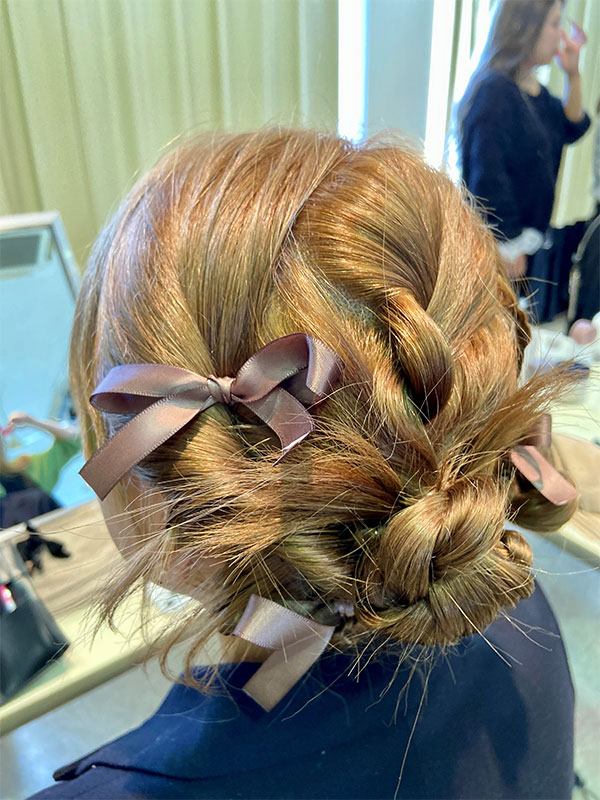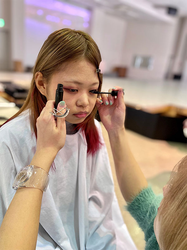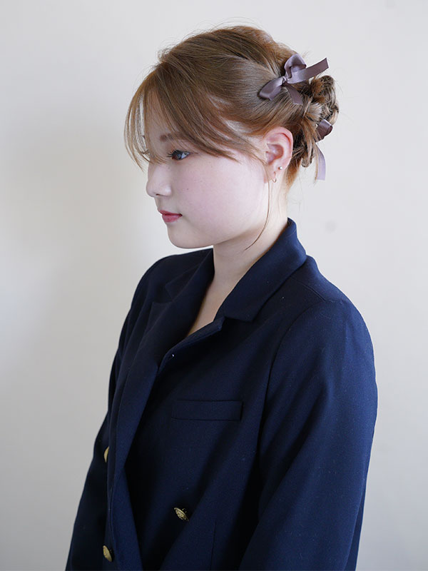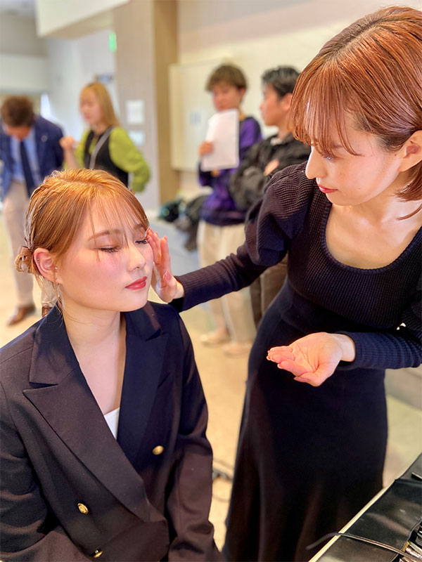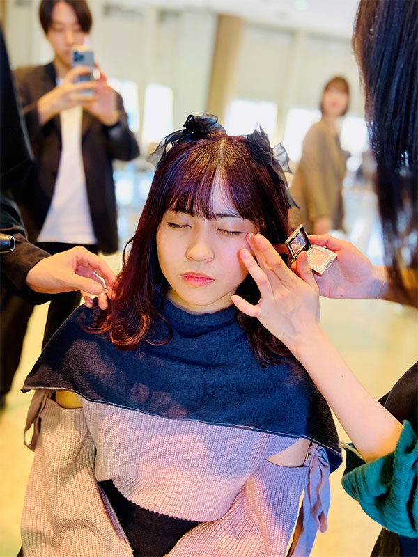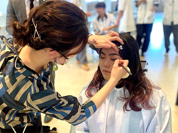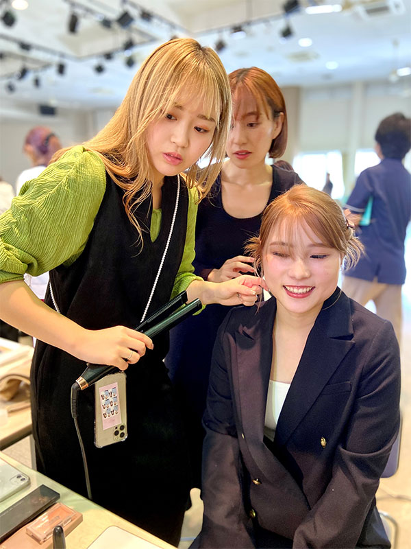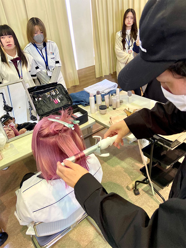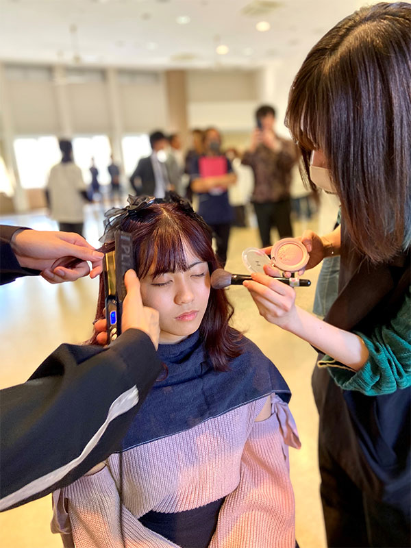 学生モデルにヘアアレンジやメイクを施しました。その後完成したヘアアレンジやメイクをプロカメラマンが撮影。フォトシューティングとしてもプロの現場を垣間見ることができました。