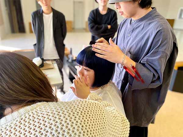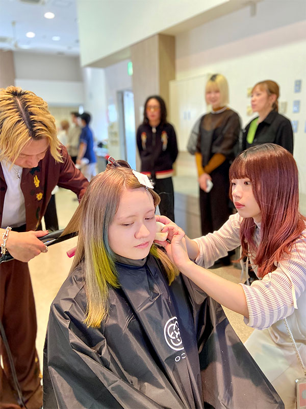 このイベントは「美容師」という素晴らしい仕事について、より仕事の理解を深めてほしい、自分の未来の美容師像をより具体化してほしい、今後の学習意欲を上げてほしい、という願いを込めて、美容総合科1年生を対象に実施しました。今回、学校の考えに賛同してくださる美容サロン様8社とメーカー様、ディーラー様各社にご協力をいただき、8ブースにてスタイリストの方々が日頃の仕事内容を披露。