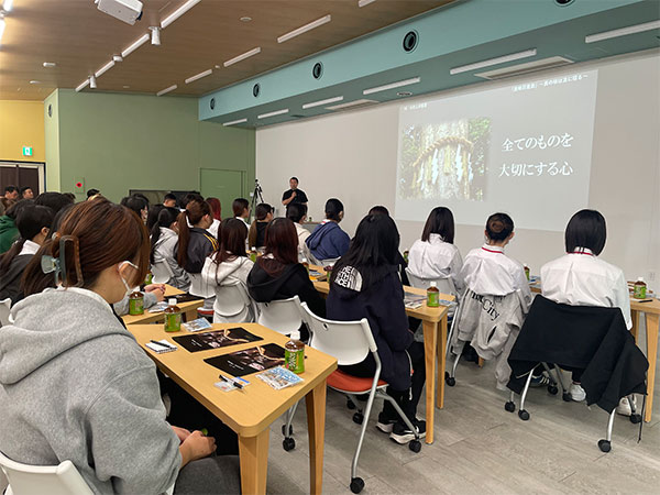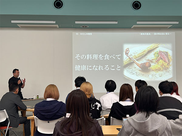 講話の内容ですが、「真味具是淡~真の味は淡に宿る~」自己紹介から始まり、茶禅華の歴史、料理人になったきっかけなど様々なお話に、学生からの質疑応答にお答えいただき学生たちも、熱心にメモを取っていました📝