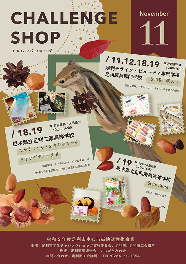 足利市内の高校生や足利デザイン・ビューティ専門学校、足利製菓専門学校の学生が日頃の学びを商店として具現化した『足利市学生チャレンジショップ』を開催いたします。