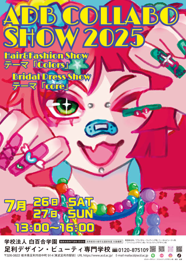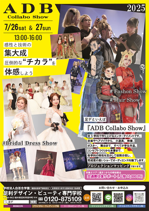 足利デザイン・ビューティ専門学校の全5学科が手掛けるヘア&ファッションショーとブライダルドレスショーを間近で見てみませんか?