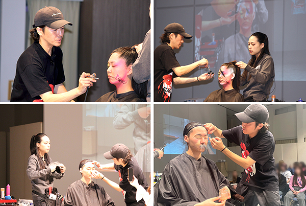 今回の講義では、本校在校生をモデルに「フェイスアートメイク」とTBSテレビにて放送中のモニタリングで担当されている「老人メイク」を披露していただきました。