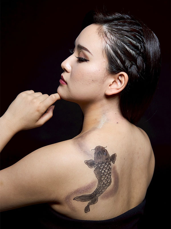 背中の鯉はアイライナーで細かく描き、ラメで川を表現しています。
